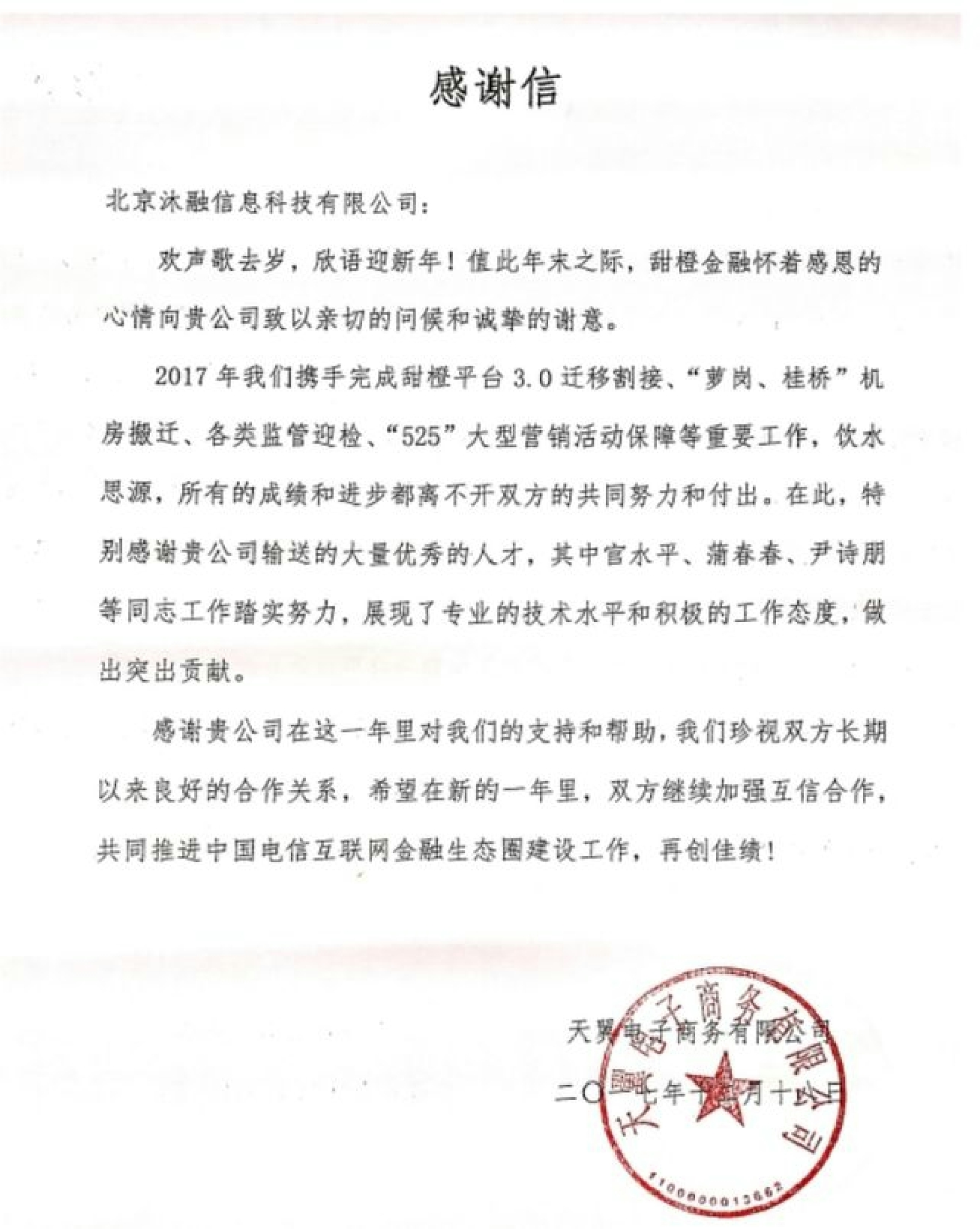北京沐融信息科技有限公司自2016年与天翼电子商务有限公司合作以来,携手度过不少难关,创造一个又一个佳绩,在确保业务增长的同时,追求更高的用户体验。在2017年,双方共同完成了甜橙平台3.0搭建及割接、“萝岗、桂桥”机房搬迁、各类监管迎检、“525”大型营销活动保障等重要工作。沐融科技在这一年中,不断提高员工技术水平,确保甜橙金融平台正常运行,获得翼支付的高度认可。今后,双方将继续加强互信合作,共同推进中国电信互联网金融生态圈建设工作。