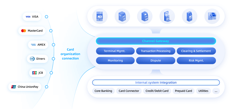 MuRong SES is built on a distributed microservices architecture that provides high scalability, openness, and agile delivery. It supports seamless integration with diverse self-service equipment, including ATMs, CDMs, and CRSs, helping banks overcome technical bottlenecks. The solution offers a comprehensive capability stack covering terminal management, transaction processing, risk-control management, dispute management, and channel gateways. It enables unified device management, remote maintenance, and real-time monitoring; efficiently handles complex services such as cross-border transactions, multi-currency exchange, and utility bill payments; and supports rapid integration with mainstream payment channels and new multi-vendor devices. Through modular design, MuRong SES addresses the diverse needs of the terminal estate, significantly enhancing service capability, optimizing customer experience, and improving operational efficiency.